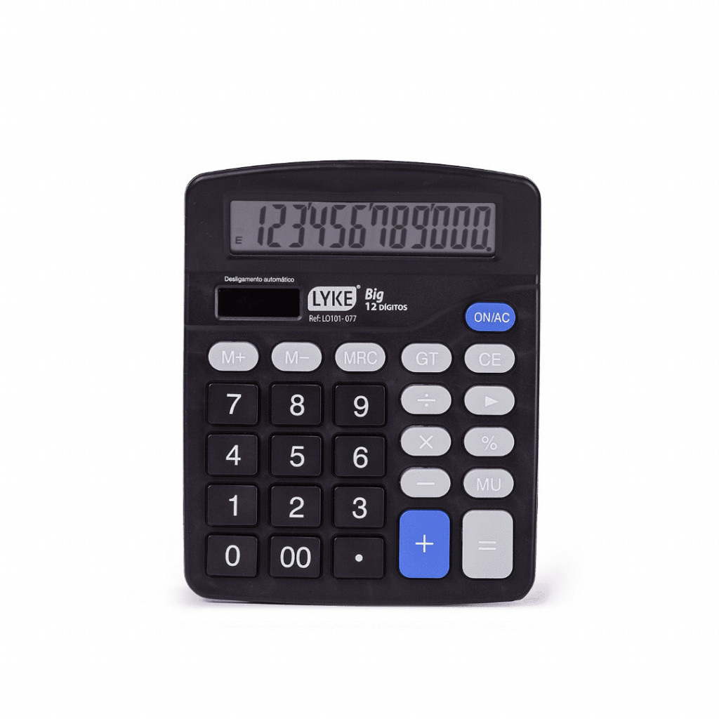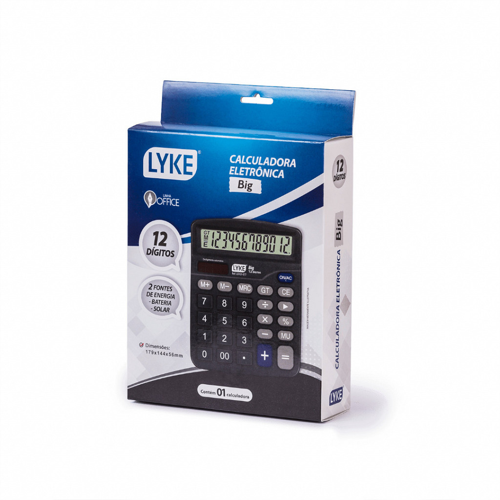 Calculadora Big LYKE com 12 dígitos, com as funções de percentual e de apagar. Teclas grandes, ideal para ser usada no dia a dia. Tamanho: 201 x 156 x 37 mm.